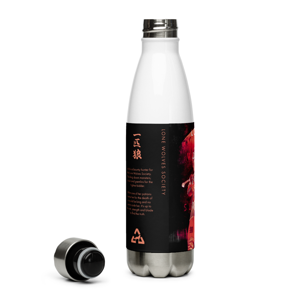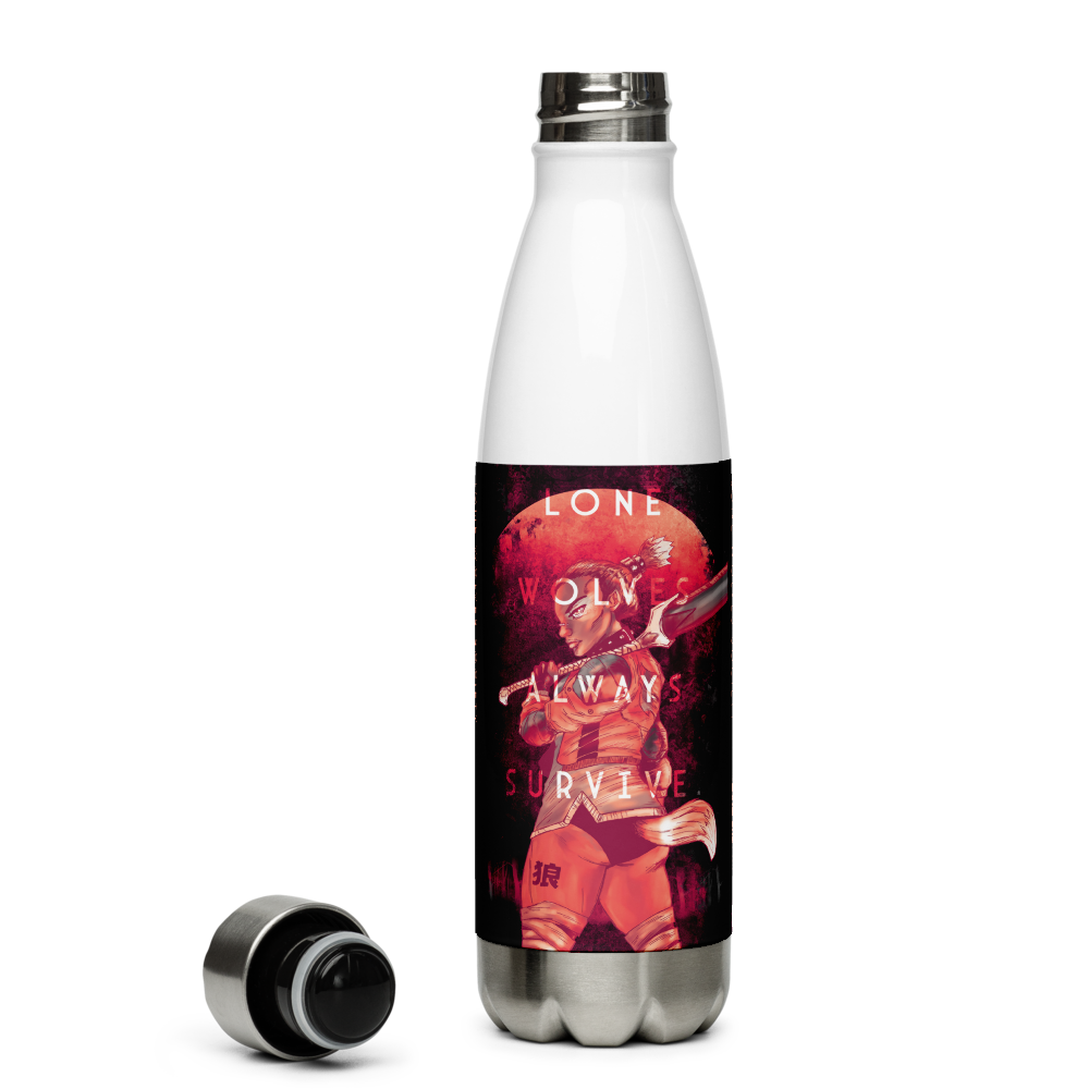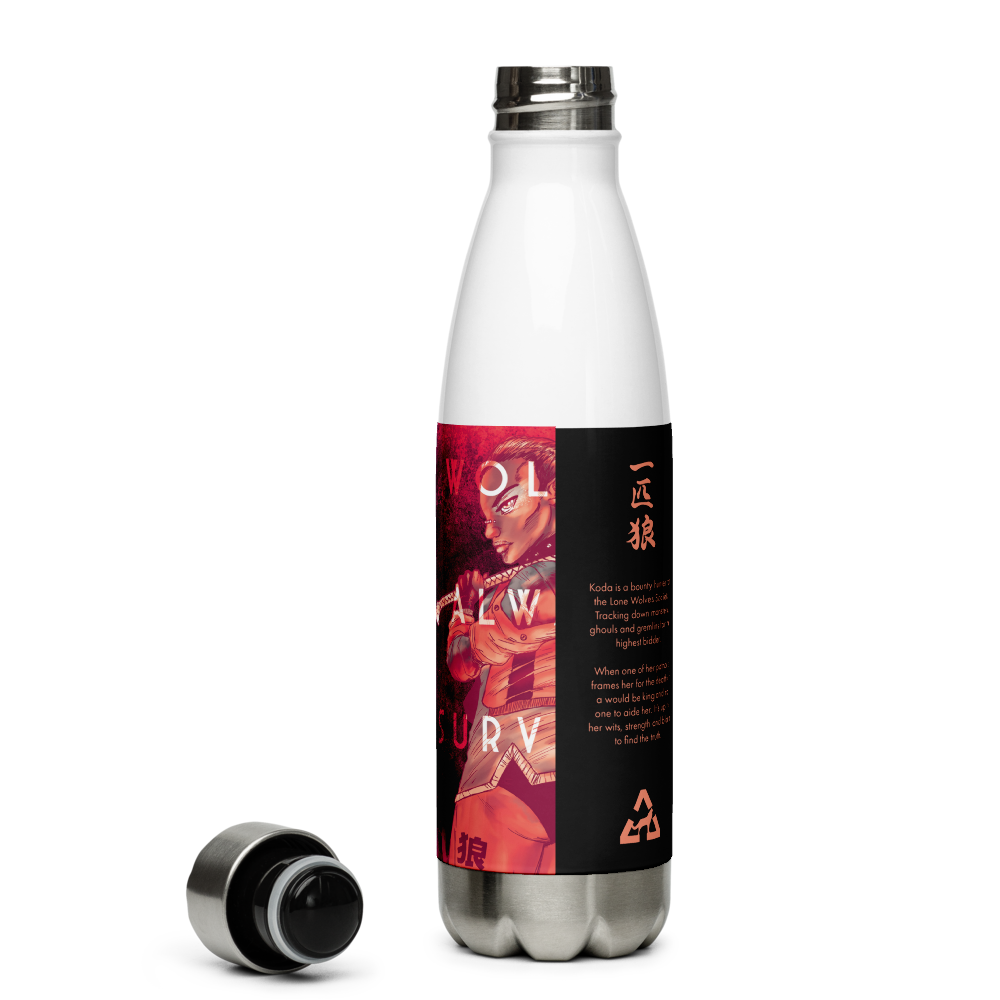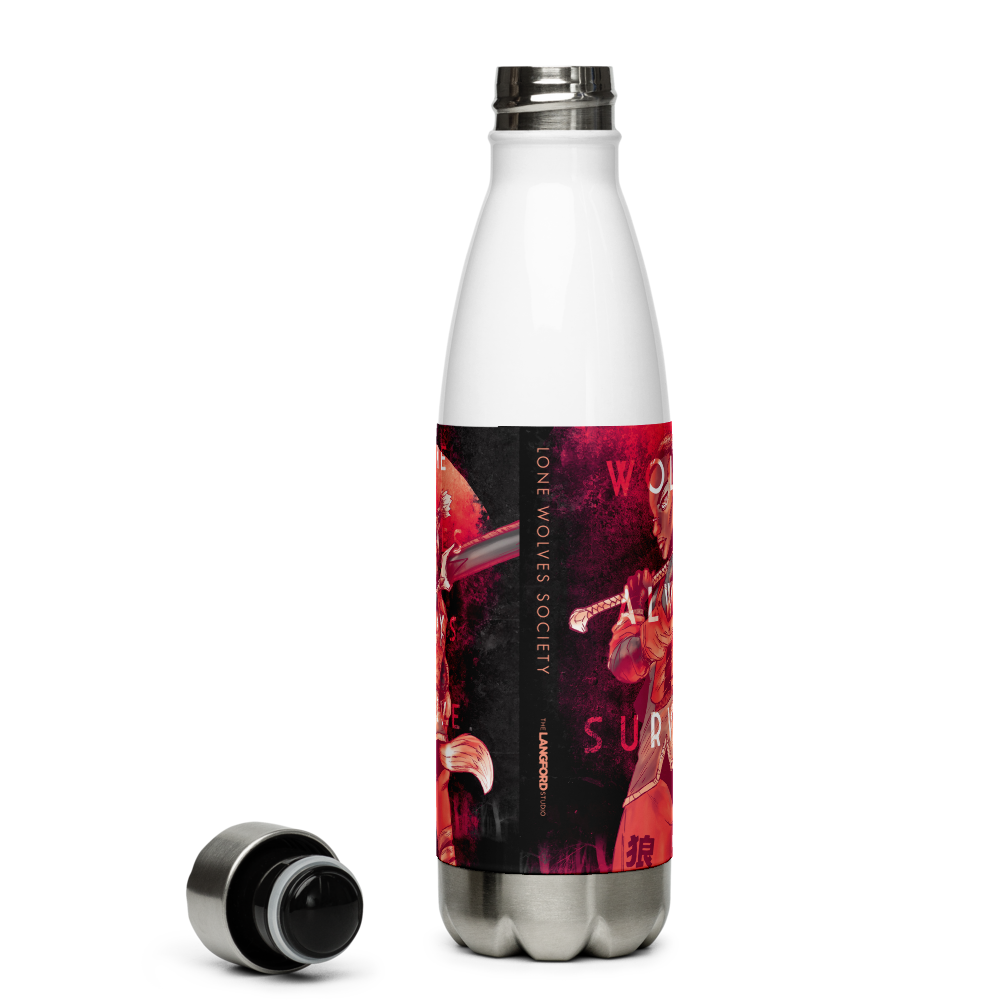 A water bottle for introverts. This is the Lone Wolves Society design from the Langford Studio. Depicting our warrior Koda.